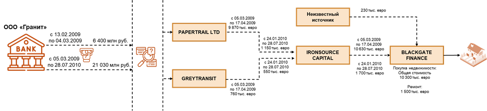 По выпискам мы проследили несколько последних звеньев цепочки финансирования. Деньги, на которые компания WhiteStone Assets приобрела активы, пришли к ней от компаний Papertrail Ltd и GreyTransit. Компании Papertrail Ltd и GreyTransit получили средства от компании IronSource Capital.