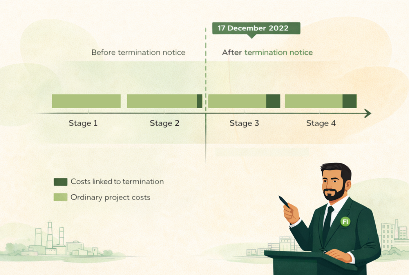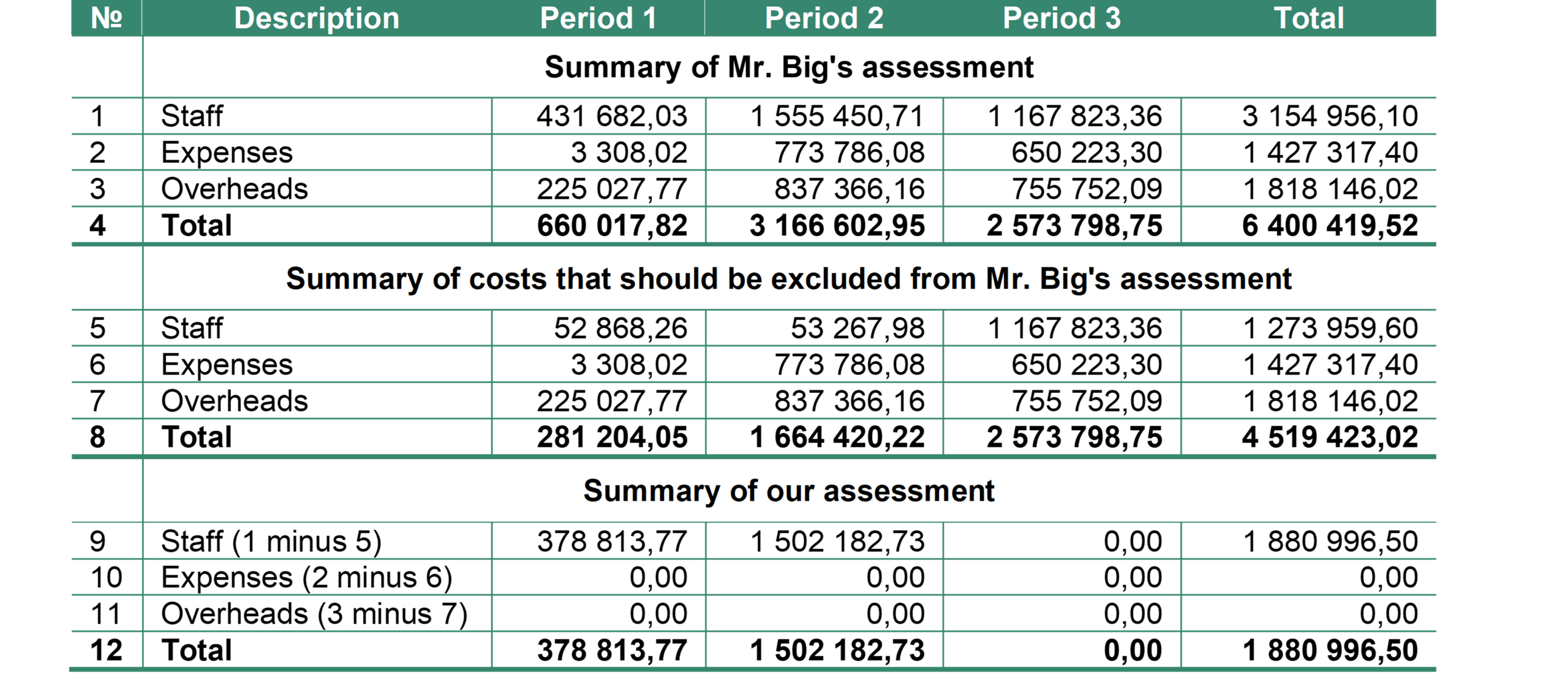 Далее мы свели разрозненные данные в единую картину. Все заявленные расходы были разложены по стадиям проекта и привязаны к конкретным датам – до и после уведомления о расторжении договора. Это позволило отделить расходы, которые действительно могли быть связаны с прекращением проекта, от затрат, возникавших в рамках обычного хода работ.